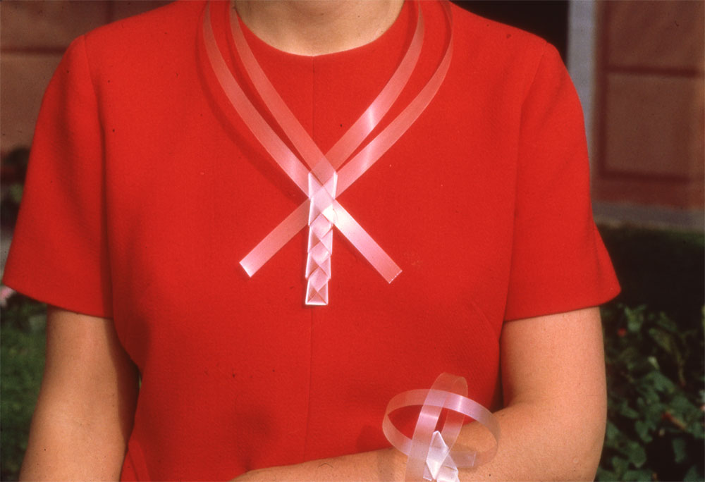 (C) One long strap is knotted twice at the centre. The two ends go round the neck, into the knots and out, forming further knots which make them change direction. The choker can be adjusted by pulling the two ends of the strap.
